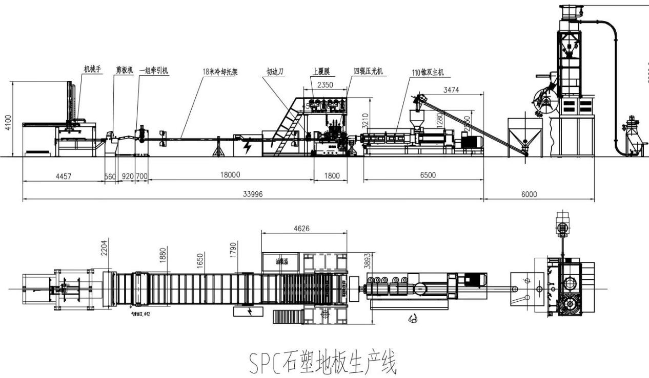 एसपीसी स्टोन-प्लास्टिक फ्लोर प्रोडक्शन लाइन एक्सट्रूडर, मोल्ड, फाइव-रोल बनाने वाली मशीन, कूलिंग सिस्टम, ट्रैक्टर, न्यू-जेनरेशन फिनिशिंग ऑटोमैटिक फिक्स्ड-लेंथ कटिंग मशीन, ऑटोमैटिक मैकेनिकल हैंड स्टेकर, आदि से बना है, और यह पूरी तरह से स्वचालित है। एसपीसी स्टोन प्लास्टिक के फर्श को एक्सट्रूडर द्वारा पीवीसी बेस सामग्री से बाहर निकाल दिया जाता है, और एक पांच-रोल कैलेंडरिंग यूनिट का उपयोग पीवीसी कलर फिल्म + पीवीसी वियर-रेसिस्टेंट लेयर को ऑनलाइन दबाने और टुकड़े टुकड़े करने के लिए किया जाता है। प्रक्रिया सरल है, और फाड़ना गोंद के बिना गर्मी द्वारा पूरा किया जाता है। एक्सट्रूडर द्वारा बाहर किए जाने के बाद और सतह कोटिंग प्रक्रिया को ऑनलाइन महसूस किया जाता है, सतह को इसके प्रदर्शन को बढ़ाने के लिए यूवी पेंट (आमतौर पर दो पास) के साथ लेपित किया जाता है, और फिर एक बहु-ब्लेड आरा द्वारा काट दिया जाता है (क्योंकि लंबाई तय की जाती है, केवल आवश्यकता है, केवल आवश्यकता है अनुदैर्ध्य बहु-ब्लेड देखा), फिर लंबवत और क्षैतिज रूप से खड़ी हो गई, और फिर पैक किया और भंडारण में डाल दिया।